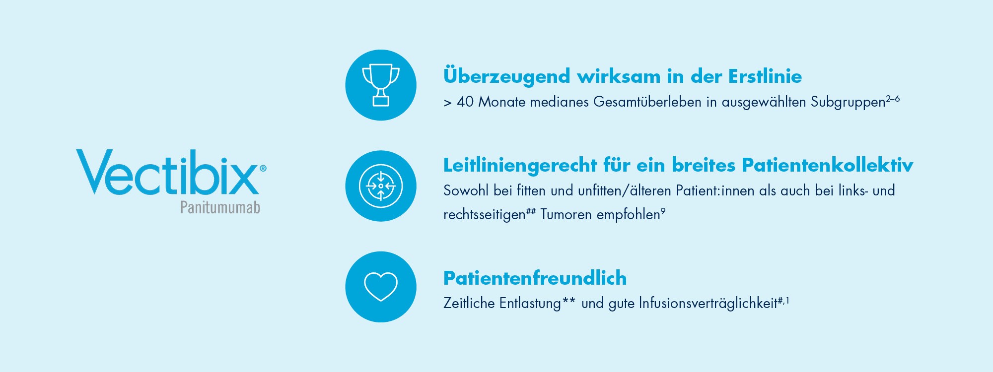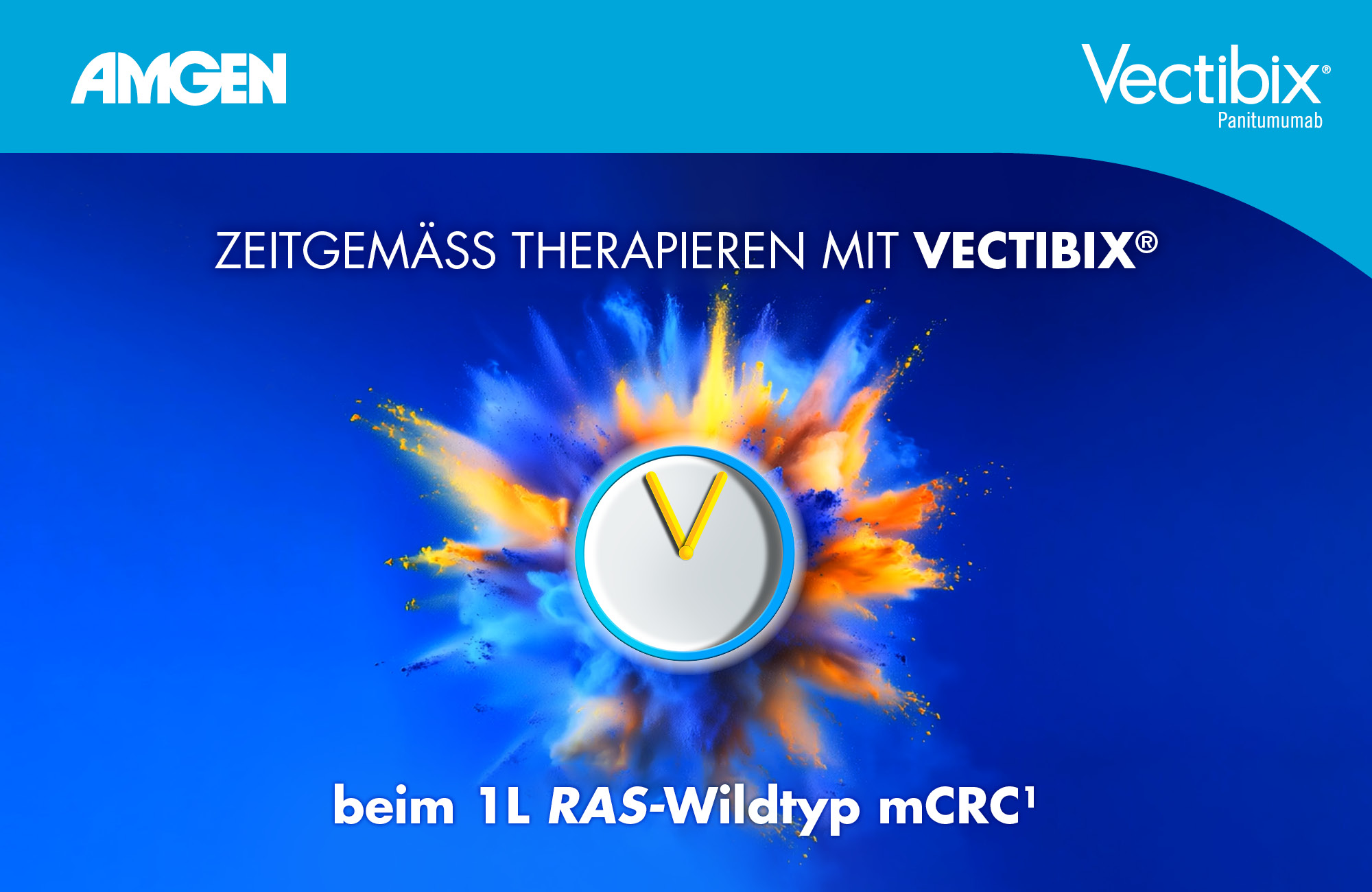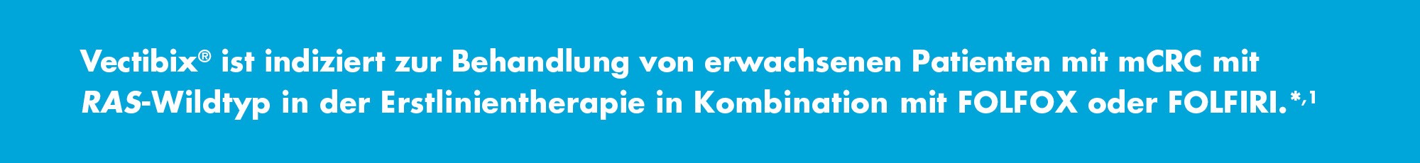 * Vectibix® ist indiziert zur Behandlung von erwachsenen Patienten mit metastasiertem kolorektalem Karzinom (mCRC, metastatic colorectal cancer) mit RAS-Wildtyp: in der Erstlinientherapie in Kombination mit FOLFOX oder FOLFIRI; in der Zweitlinientherapie in Kombination mit FOLFIRI bei Patienten, die in der Erstlinientherapie eine Fluoropyrimidinhaltige Chemotherapie erhalten haben (ausgenommen Irinotecan); als Monotherapie nach Versagen von Fluoropyrimidin-, Oxaliplatin- und Irinotecan-haltigen Chemotherapieregimen.1