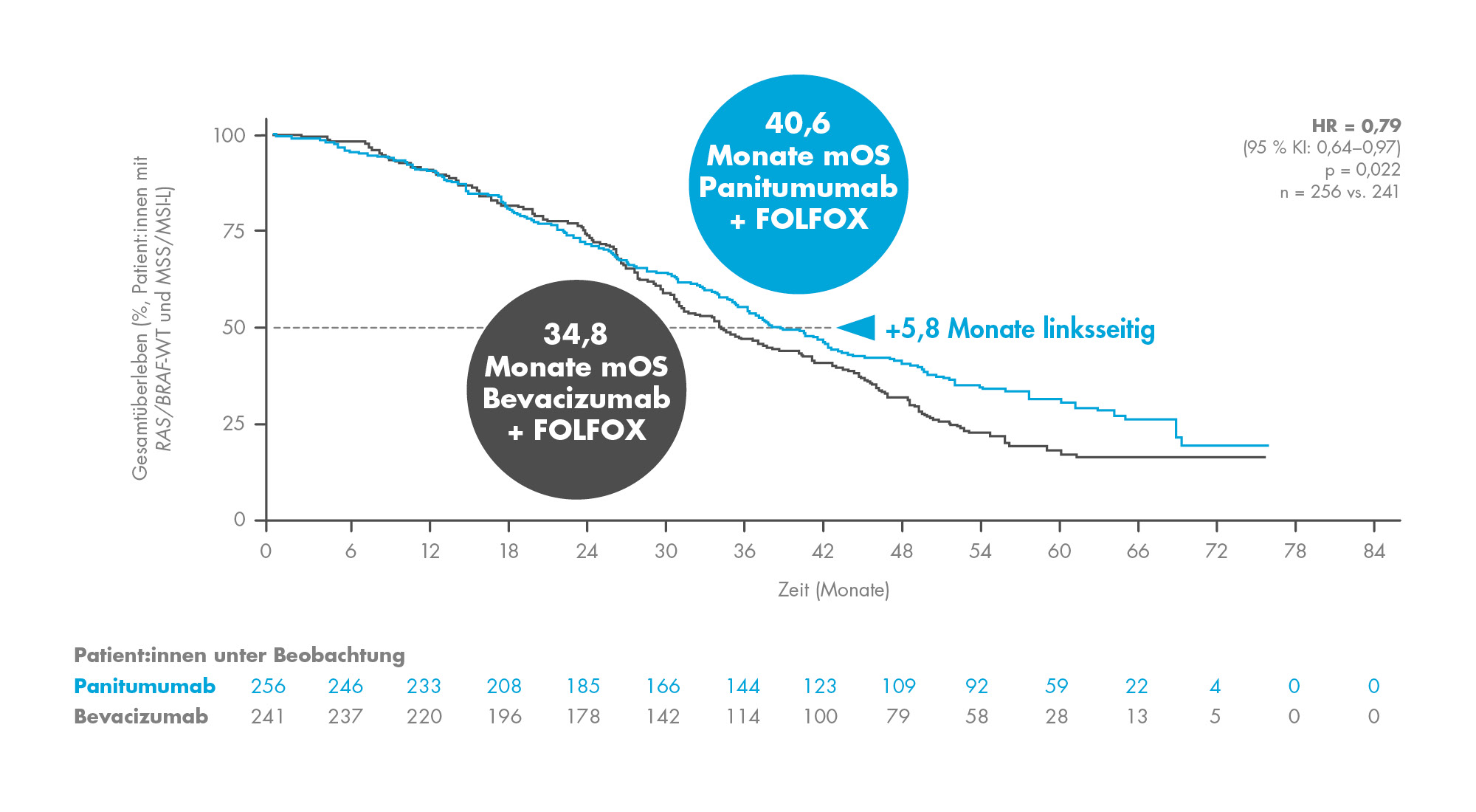 Bei triple-selektierten Patient:innen (RAS-WT/BRAF-WT und MSS/MSI-L-Status) mit linksseitigen Tumoren ergab sich ein medianes Gesamtüberleben (mOS) von 40,6 Monaten unter Vectibix® + mFOLFOX6 vs. 34,8 Monaten unter Bevacizumab + mFOLFOX6.3